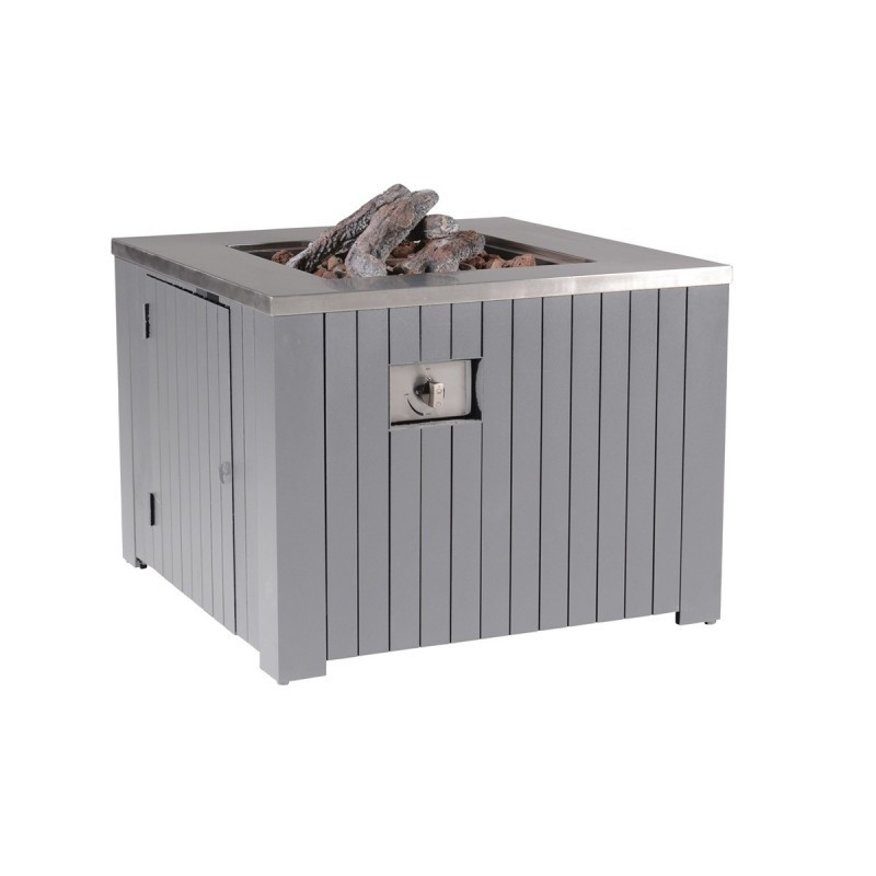 De sfeerhaard heeft een RVS gasbrander. Het topblad is van RVS en met weerbestendige planken afgewerkt. De haard heeft een afmeting van 80 x 80 centimeter en een gasfles is eenvoudig te verbergen via een luik in de tafel. Door de draaiknop is de bediening zeer eenvoudig.