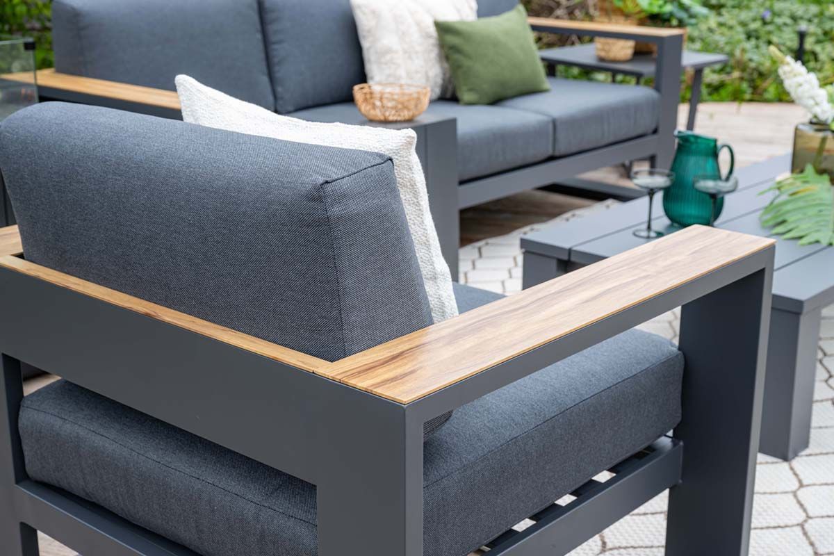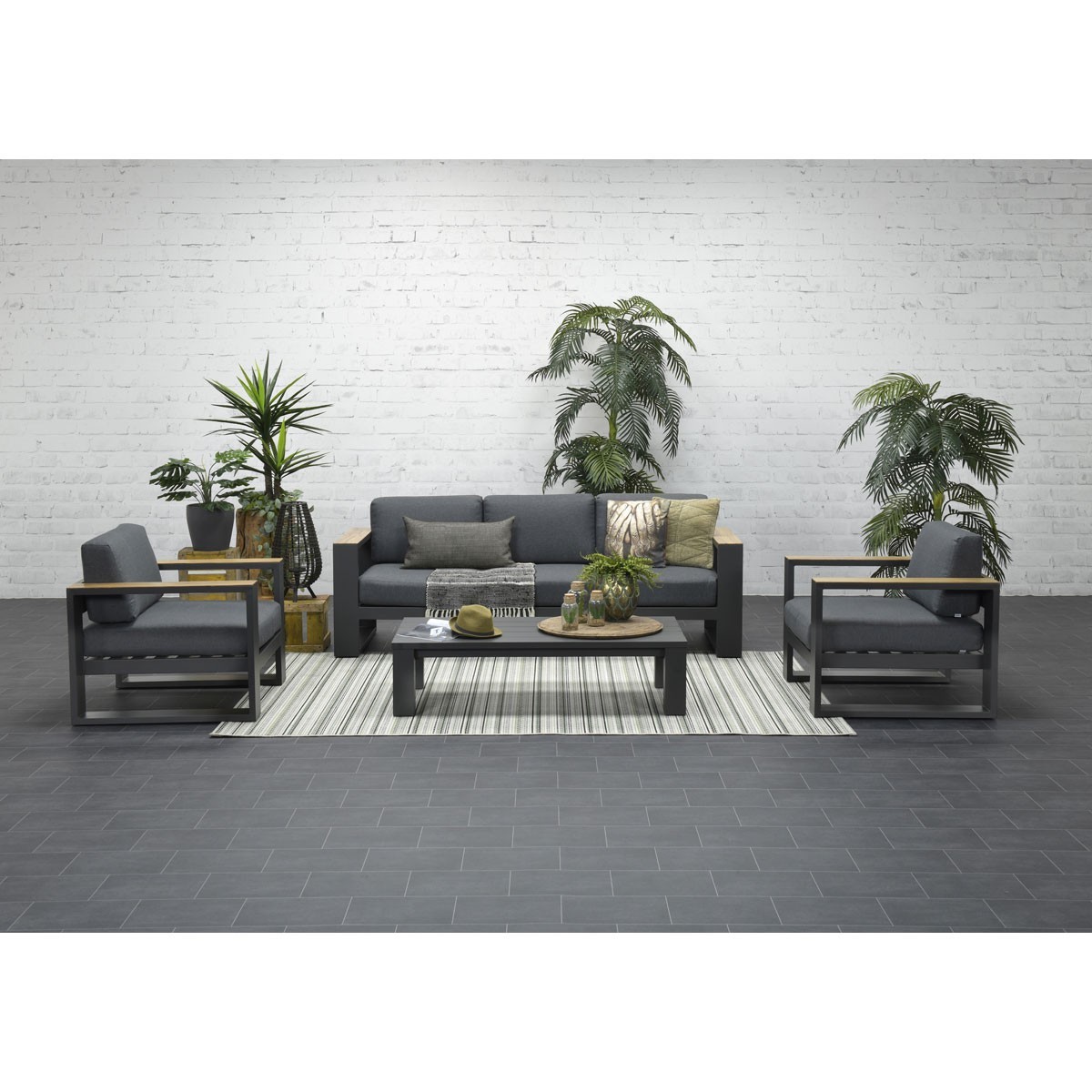 Het frame is volledig gemaakt van aluminium met een beschermende poedercoating in de kleur carbon black. Aan de bovenkant zit een aluminium plaat met een print van teak. Aluminium kan niet roesten en is onderhoudsvriendelijk. De antraciet kleurige kussens hebben een waterafstotende coating, een korte regenbui is hierdoor geen probleem. Het water kunt u er gewoon weer afkloppen. Dit is echter geen all weather materiaal, dus als u de stoel een langere tijd niet gebruikt, wordt geadviseerd om de kussens droog en schoon op te bergen in bijvoorbeeld een kussenbox.