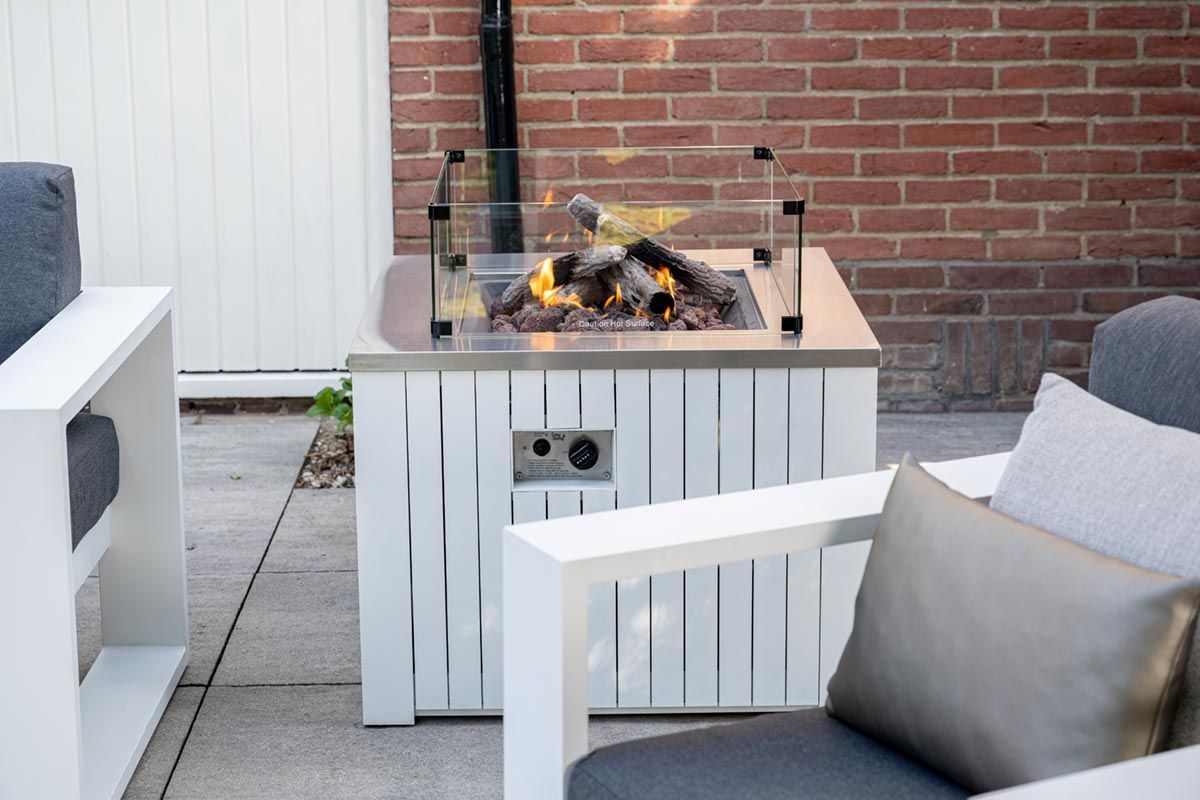 Het frame is volledig gemaakt van aluminium met een beschermende poedercoating in de kleur mat wit. Aan de bovenkant zit een aluminium plaat met een print van teak. Aluminium kan niet roesten en is onderhoudsvriendelijk. De antracietkleurige kussens hebben een waterafstotende coating, een korte regenbui is hierdoor geen probleem. Het water kunt u er gewoon weer afkloppen. Dit is echter geen all weather materiaal, dus als u de stoel een langere tijd niet gebruikt, wordt geadviseerd om de kussens droog en schoon op te bergen in bijvoorbeeld een kussenbox.