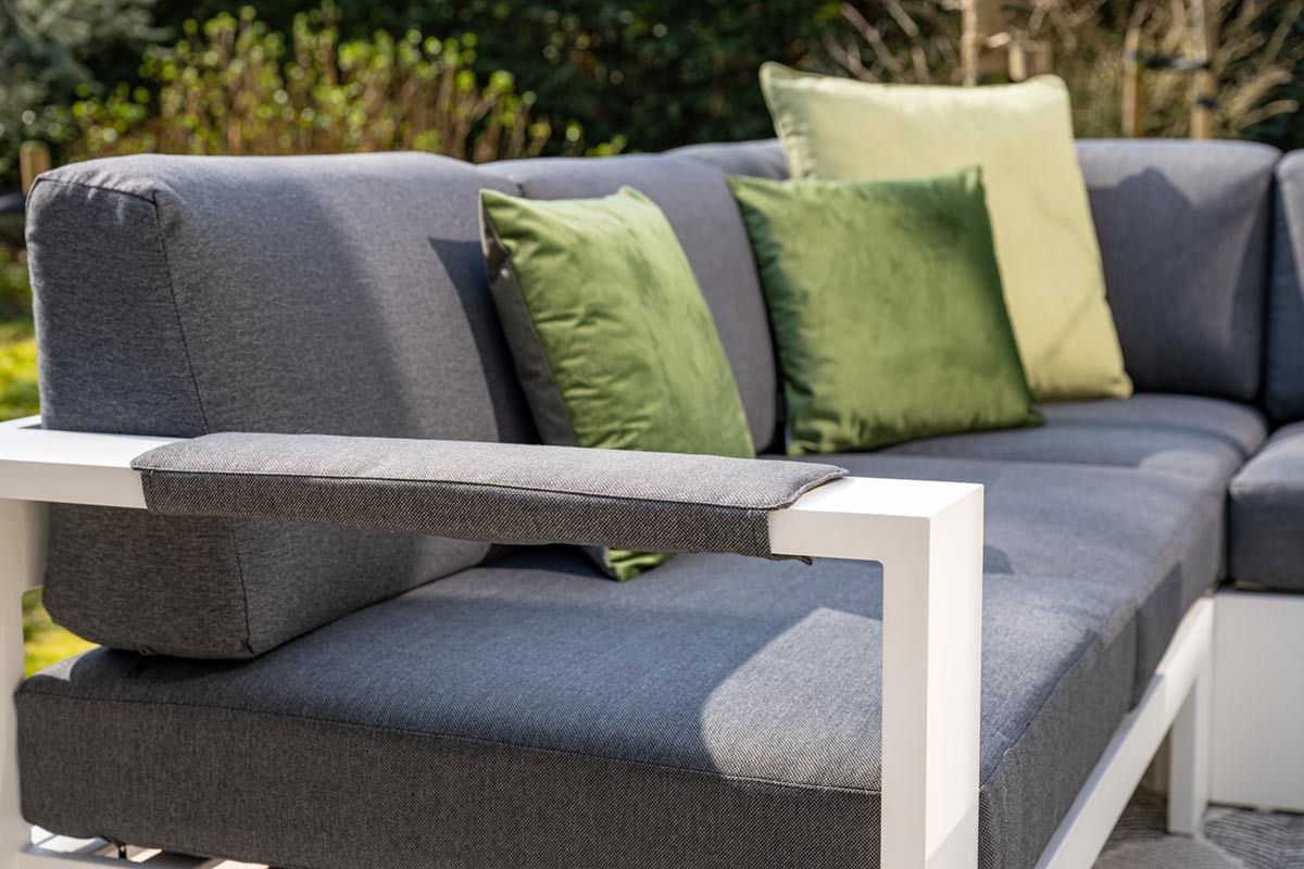 Het frame is volledig gemaakt van aluminium met een beschermende poedercoating in de kleur mat wit. Aluminium kan niet roesten en is onderhoudsvriendelijk. De antracietkleurige kussens hebben een waterafstotende coating, een korte regenbui is hierdoor geen probleem. Het water kunt u er gewoon weer afkloppen. Dit is echter geen all weather materiaal, dus als u de set een langere tijd niet gebruikt, wordt geadviseerd om de kussens droog en schoon op te bergen in bijvoorbeeld een kussenbox.