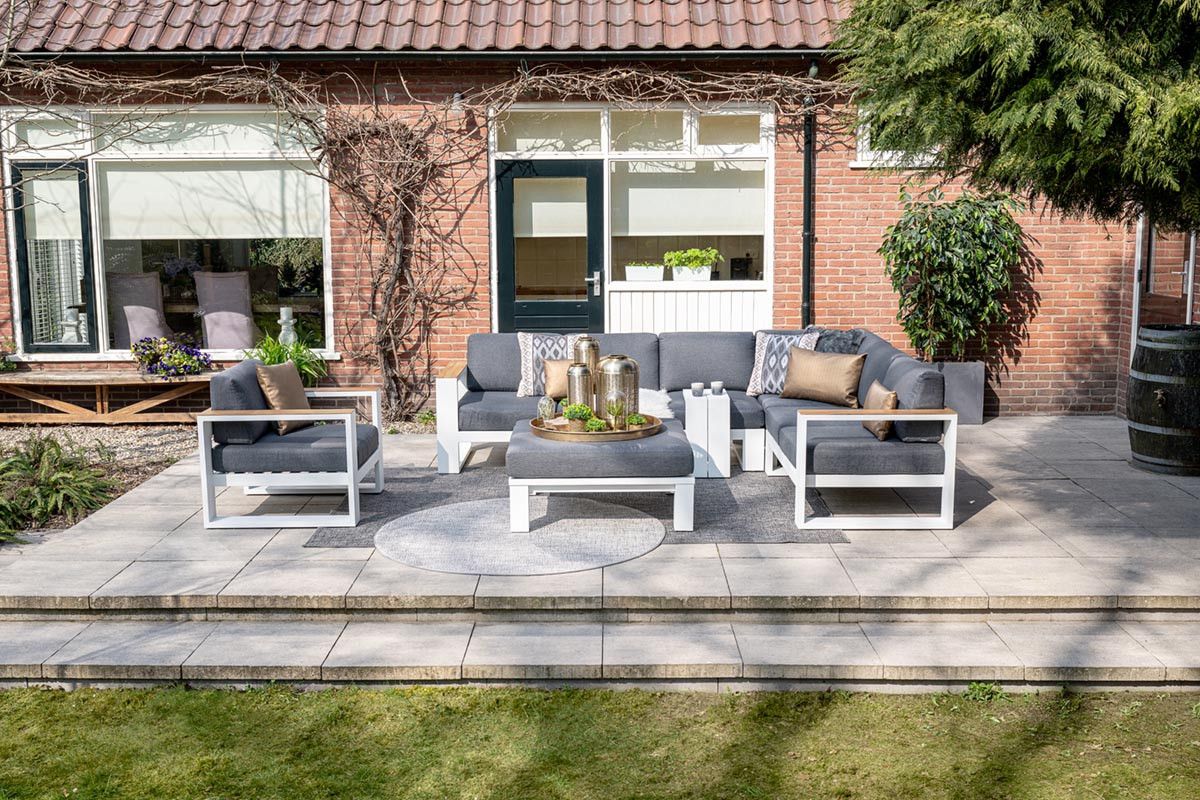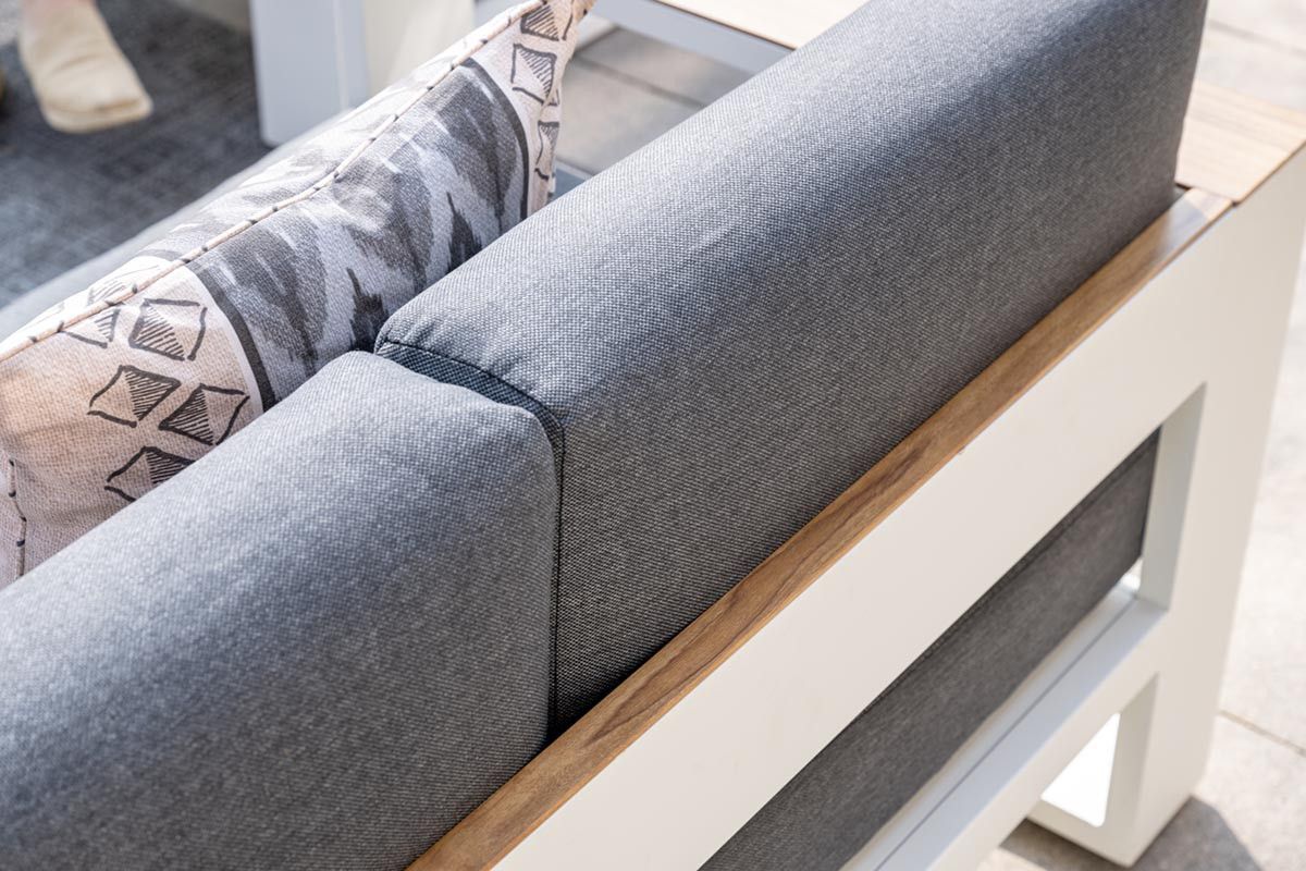 Het frame is volledig gemaakt van aluminium met een beschermende poedercoating in de kleur mat wit. Aluminium kan niet roesten en is onderhoudsvriendelijk. De reflex-black gekleurde kussens hebben een waterafstotende coating, een korte regenbui is hierdoor geen probleem. Het water kunt u er gewoon weer afkloppen. Dit is echter geen all weather materiaal, dus als u de set een langere tijd niet gebruikt, wordt geadviseerd om de kussens droog en schoon op te bergen in bijvoorbeeld een kussenbox.