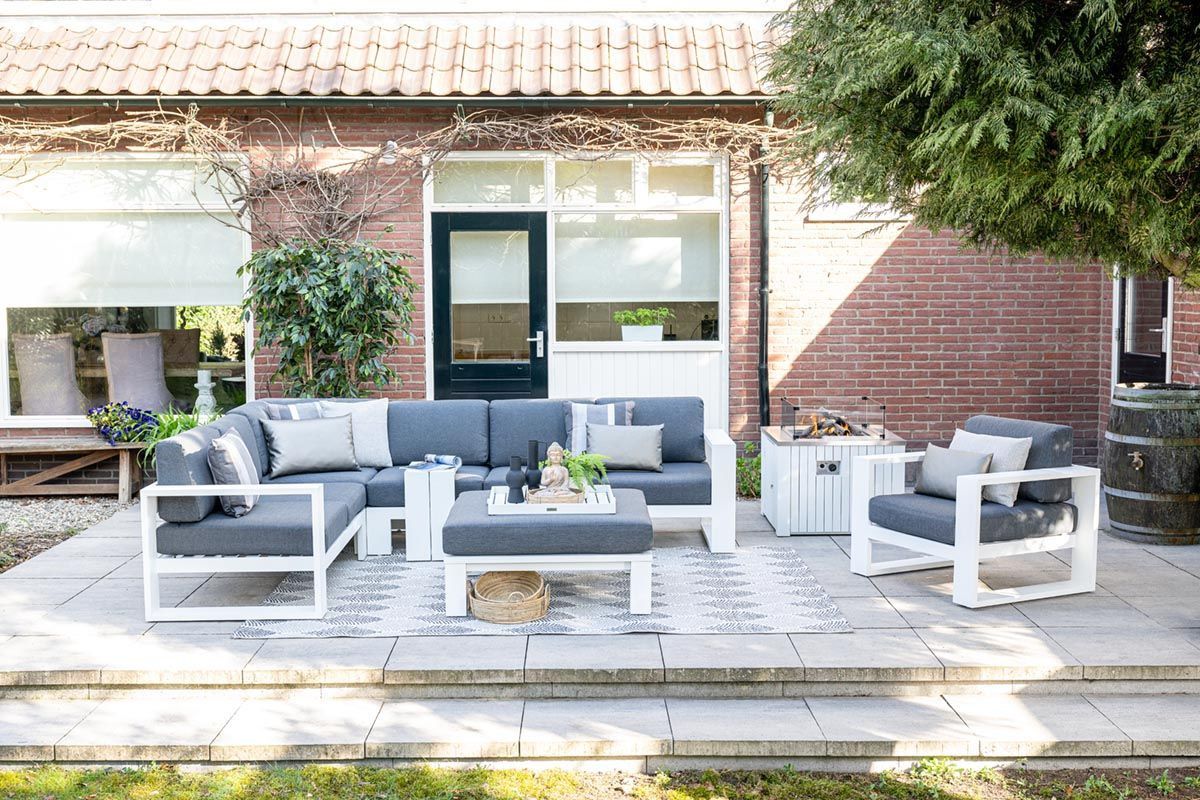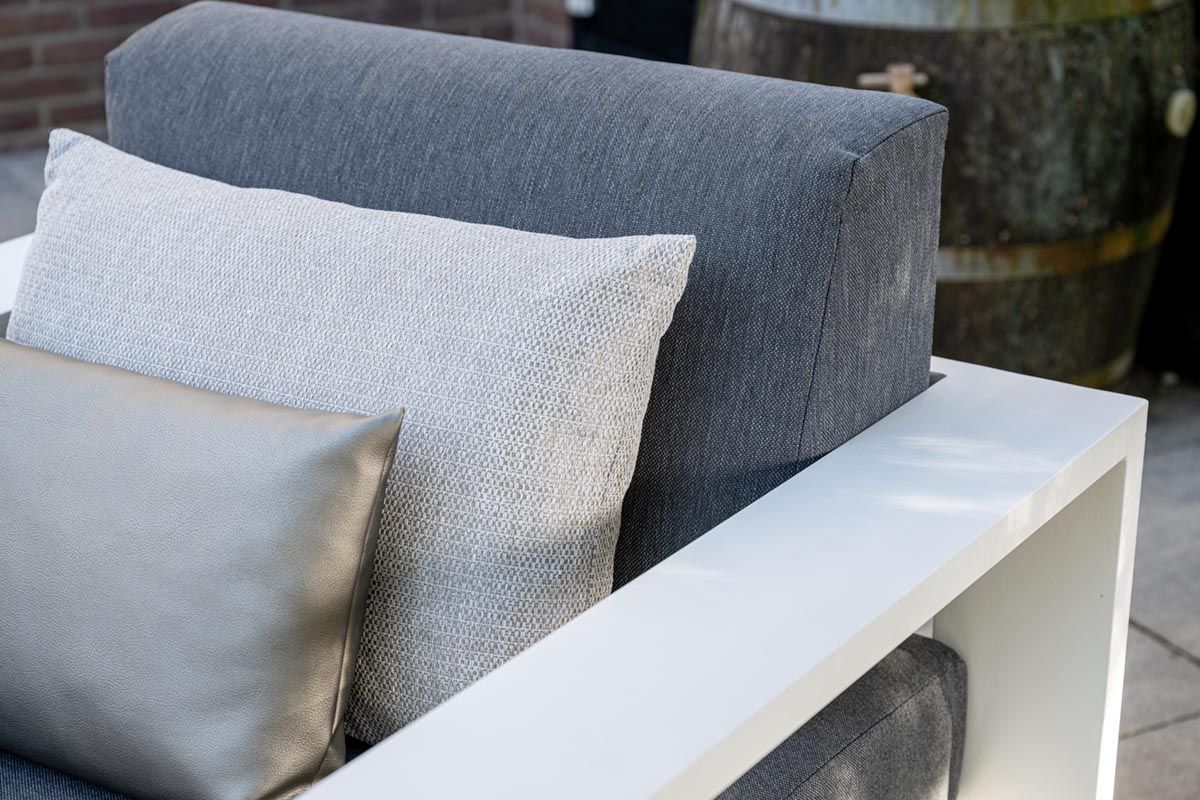 Het frame is volledig gemaakt van aluminium met een beschermende poedercoating in de kleur mat wit. Aluminium kan niet roesten en is onderhoudsvriendelijk. De reflex-black gekleurde kussens hebben een waterafstotende coating, een korte regenbui is hierdoor geen probleem. Het water kunt u er gewoon weer afkloppen. Dit is echter geen all weather materiaal, dus als u de set een langere tijd niet gebruikt, wordt geadviseerd om de kussens droog en schoon op te bergen in bijvoorbeeld een kussenbox.