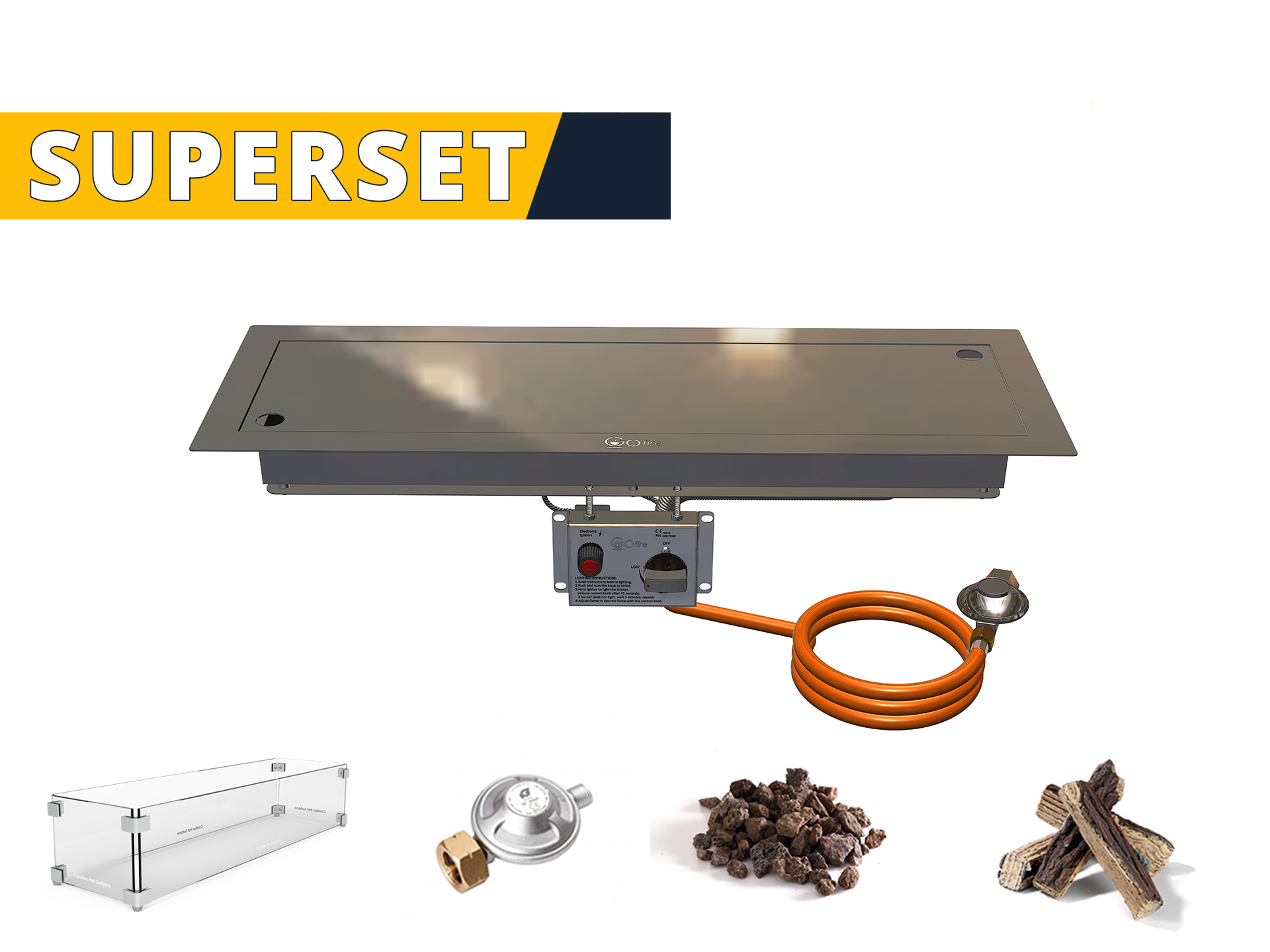 - GoFire inbouwbrander superset wordt compleet geleverd inclusief gasdrukregelaar, keramische houtblokken, lavastenen en rechthoekige glazen ombouw.